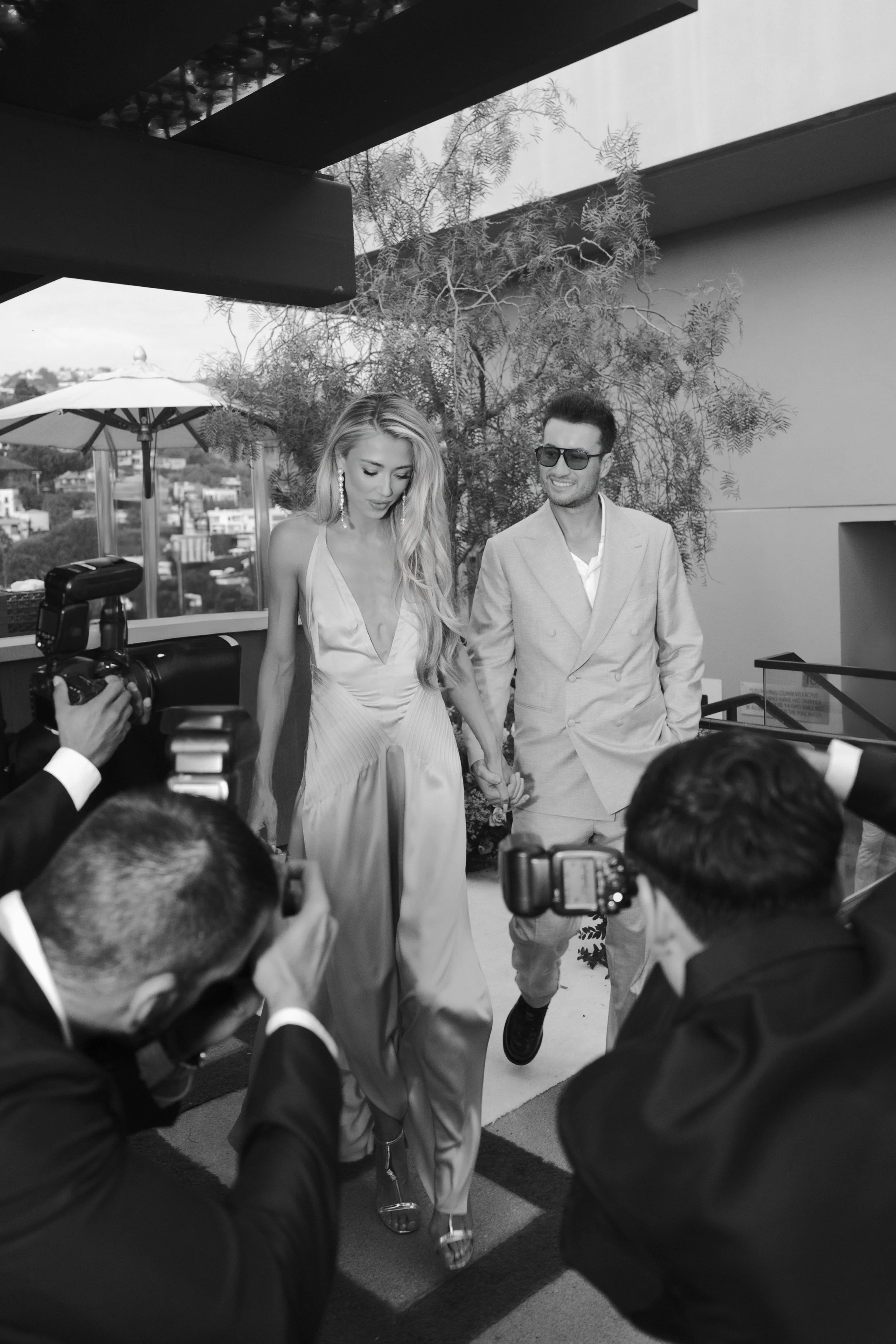 Festivities for Tess & Shaun’s wedding was a three day affair, beginning with a welcome party that was Iconically LA. Guests arrived to a floral-carpeted staircase, setting the scene for a night of Hollywood glamour. Paparazzi greeted them at the entrance, capturing every arrival — a playful nod to celebrity culture and a fun, classic introduction to the evening.